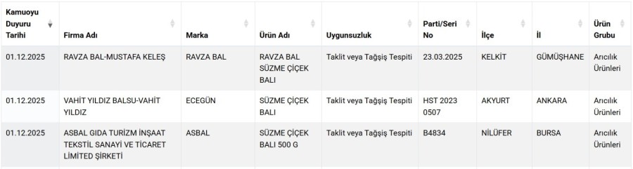 Bakanlığın yayımladığı listeye göre, Gümüşhane Kelkit'teki 'Ravza Bal - Mustafa Keleş' firmasına ait 'Ravza Bal Süzme Çiçek Balı', Ankara Akyurt'taki 'Vahit Yıldız Balsu - Vahit Yıldız' firmasına ait 'Ecegün Süzme Çiçek Balı', Bursa Nilüfer'deki Asbal Gıda firmasına ait 'Asbal Süzme Çiçek Balı 500 G' ürünlerinde taklit veya tağşiş yapıldığı belirlendi. Bakanlık, vatandaşların sağlıklı gıdalara ulaşabilmesi için güncel listeleri "guvenilirgida.tarimorman.gov.tr" adresi üzerinden paylaşıyor.