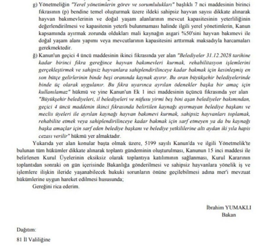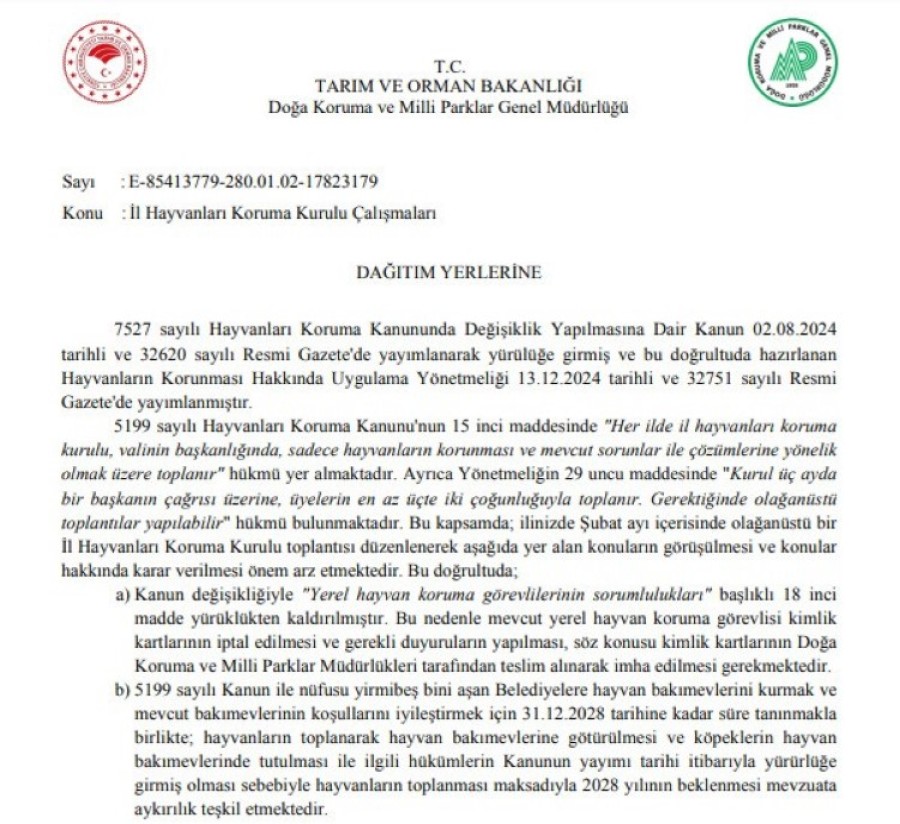 Tarım ve Orman Bakanlığı, 81 il valiliğine sahipsiz sokak hayvanlarıyla ilgili olarak yazı gönderdi. Bakanlık yazısında, sahipsiz sokak hayvanlarının toplatılması için belediyelere 2028'e kadar süre verildiği iddiası yalanlandı.