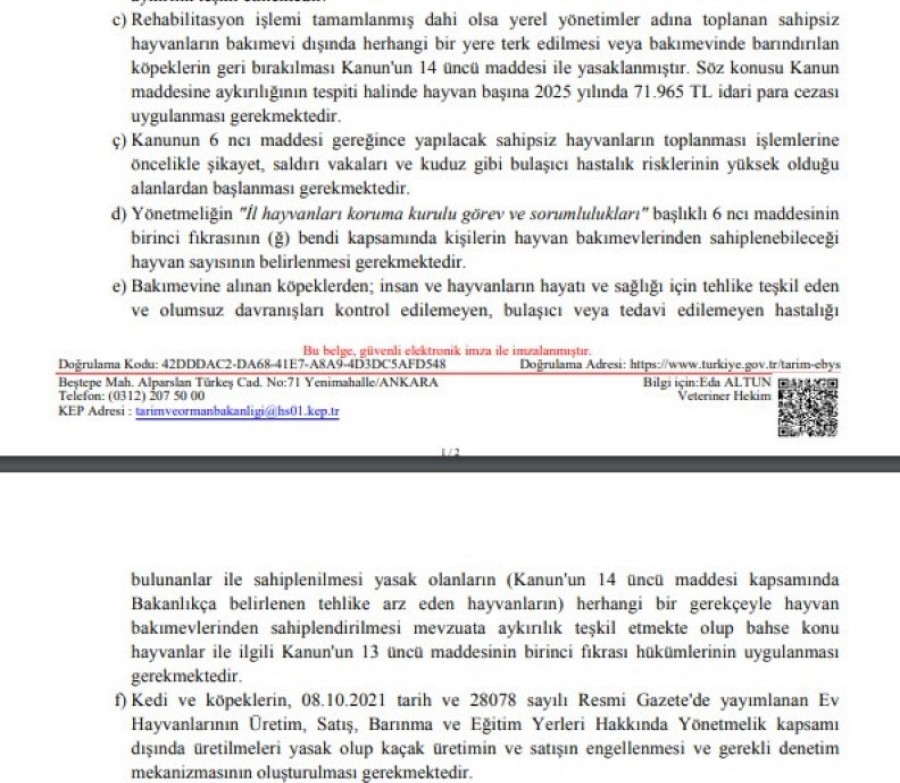 Belediyelerin, sahipsiz sokak hayvanlarını hemen toplamaları gerektiği belirtilen bakanlık yazısında, sokakta bırakılan her bir sahipsiz hayvan için 71 bin 965 lira para cezası uygulanacağı ifade edildi.