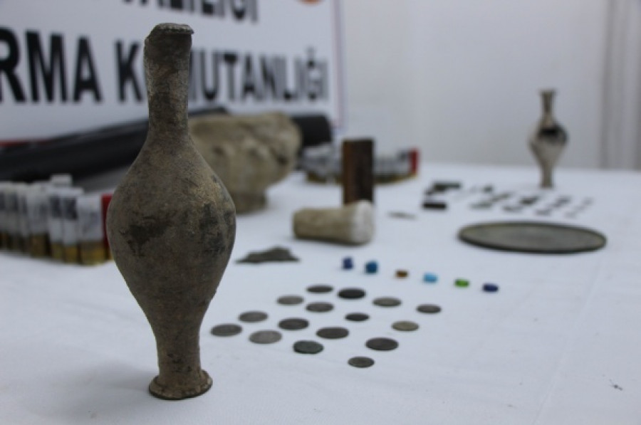 Soruşturmayı derinleştiren jandarma ekiplerinin il merkezindeki M.D.'nin iş yerinde yapılan aramada ise erken Roma dönemine ait 43 sikke, bir yüzünde Hz. İsa diğer yüzünde Hz. Meryem figürlü tunç tablet, 1 Hz. İsa figürlü metal haç, 1 metal kolye ucu, 1 mühür, 1 dibek ve tokmağı ile 7 cam obje tespit edildi.