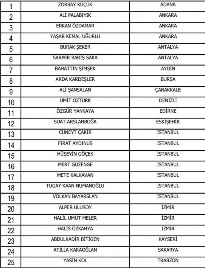 "Zorbay Küçük, Ali Palabıyık, Erkan Özdamar, Yaşar Kemal Uğurlu, Burak Şeker, Sarper Barış Saka, Bahattin Şimşek, Arda Kardeşler, Ali Şansalan, Ümit Öztürk, Özgür Yankaya, Suat Arslanboğa, Cüneyt Çakır, Fırat Aydınus, Hüseyin Göçek, Mert Güzenge, Mete Kalkavan, Tugay Kaan Numanoğlu, Volkan Bayarslan, Alper Ulusoy, Halil Umut Meler, Halis Özkahya, Abdulkadir Bitigen, Atilla Karaoğlan, Yasin Kol."