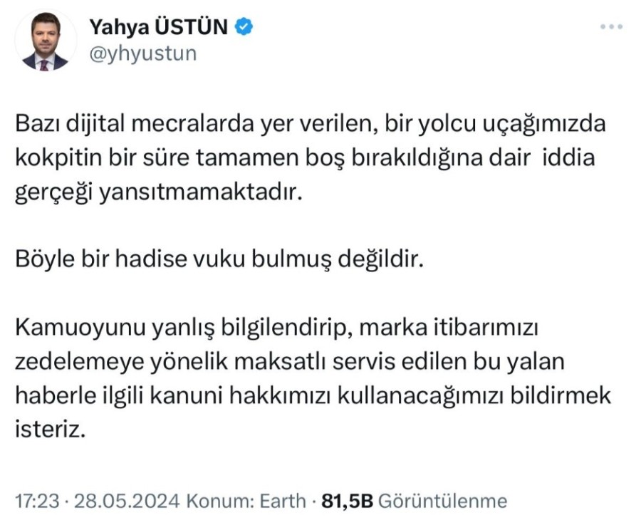 İddia üzerine THY'den konu ile ilgili açıklama geldi. Türk Hava Yolları Basın Müşaviri Yahya Üstün, sosyal medya hesabından yaptığı açıklamada, "Bazı dijital mecralarda yer verilen, bir yolcu uçağımızda kokpitin bir süre tamamen boş bırakıldığına dair iddia gerçeği yansıtmamaktadır. Böyle bir hadise vuku bulmuş değildir. Kamuoyunu yanlış bilgilendirip, marka itibarımızı zedelemeye yönelik maksatlı servis edilen bu yalan haberle ilgili kanuni hakkımızı kullanacağımızı bildirmek isteriz" açıklamasında bulunarak iddiaları yalanladı.