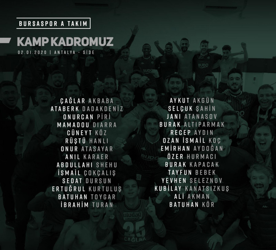 Devre arası hazırlıkları için Antalya'yı seçen Bursaspor, kampta Trabzonspor ve Konyaspor ile hazırlık maçı oynayacak. 28 kişilik kamp kadrosuna altyapıdan stoper Ertuğrul Kurtuluş, sağ bek İbrahim Turan, sol bek Batuhan Toygar, orta saha Ozan İsmail Koç, kanat Tayfun Bebek ve forvet Batuhan Kör'ü dahil eden Teknik Direktör İbrahim Üzülmez, Latovlevici, Igor ve Musa Araz'ı kamp kadrosuna almadı.
