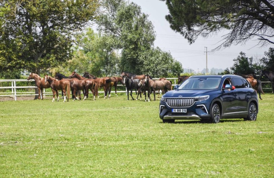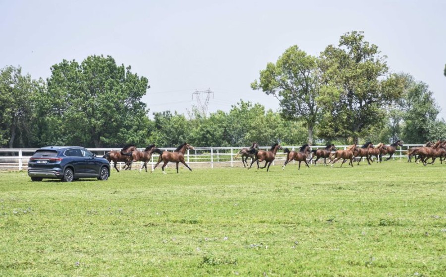 Türkiye'nin yerli ve milli otomobili Togg, yetiştirdiği yarış atlarıyla dünyaca ünlü olan TİGEM'in Karacabey Harası'nda şampiyon atlarla yarıştı.