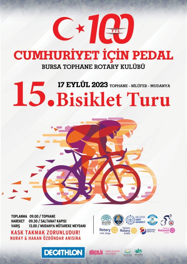 Tophane Rotary Kulübü tarafından bu sene 15'incisi organize edilen "Tophane'den Mudanya'ya Bisiklet Turu" etkinliği Cumhuriyetin kuruluşunun 100. Yıl dönümü dolayısıyla "Cumhuriyet İçin Pedal" temasıyla 17 Eylül'de gerçekleştirilecek.