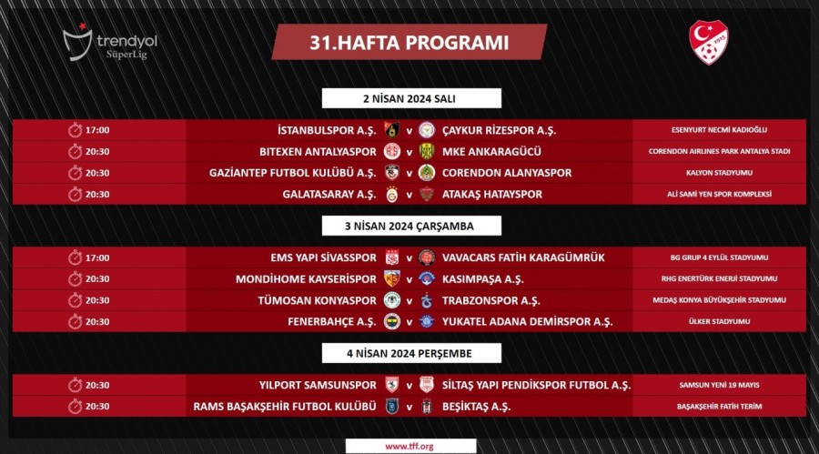 Süper Lig'de 31. haftanın programı şu şekilde: