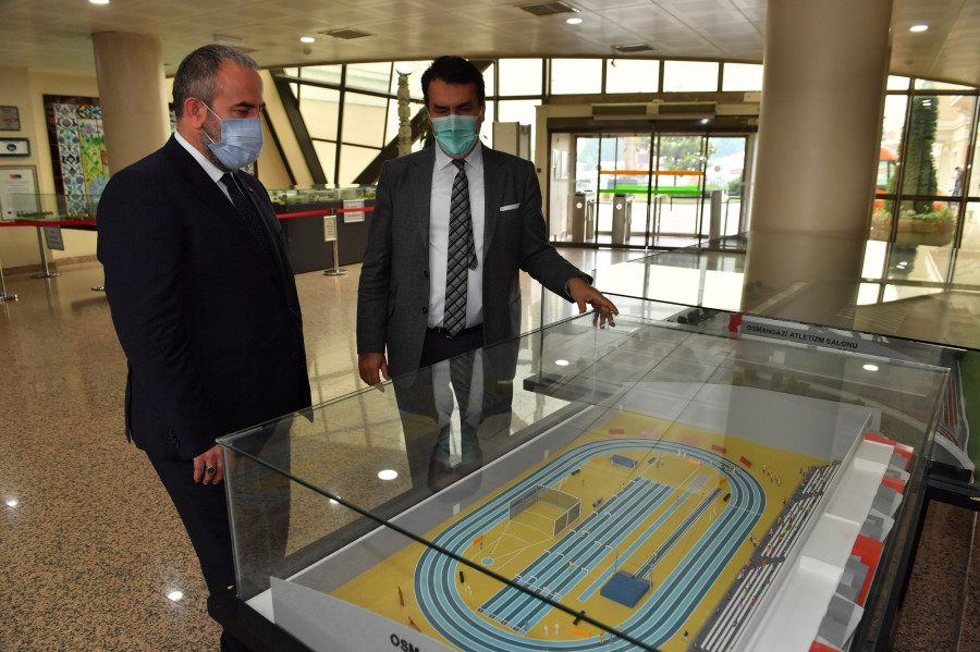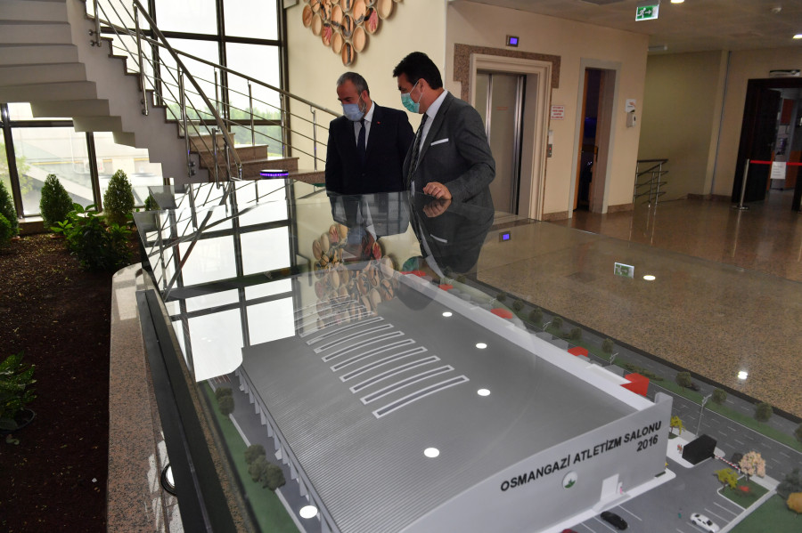 Protokol imza törenini ardından Başkan Dündar, Bursa Gençlik ve Spor İl Müdürlü Başparmak'a Osmangazi Atletizm Salonu maketini göstererek, salon hakkında bilgiler verdi.