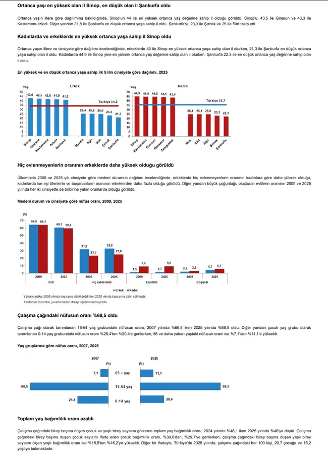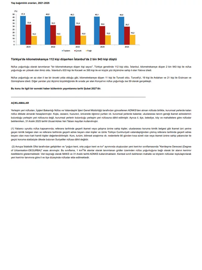 Türkiye İstatistik Kurumu (TÜİK), 2025 yılına ilişkin nüfus verilerini kamuoyuyla paylaştı. Açıklanan resmi rakamlara göre Türkiye'nin toplam nüfusu 2025 yılında 86 milyon 92 bin 168 kişi oldu.
