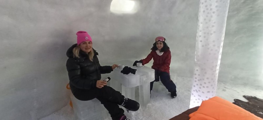 Yaklaşık 4 ay önce yapılan iglo ev ise, halen aynı ihtişamıyla ayakta durması dikkat çekti. Buzdan evin içinde konaklayan misafirler uyku tulumlarıyla uyurken, herhangi bir ısınma sistemi olmamasına rağmen sıcaklık dışarıya göre 7 derece daha yüksek olarak ölçülüyor. Buzdan evler misafirlere bungalov evlerle birlikte kiralanıyor. Farklı bir deneyim yaşamak isteyen misafirler isterlerse bungalov evlerde kalıyor ya da iglo evlerde geceleyebiliyor.