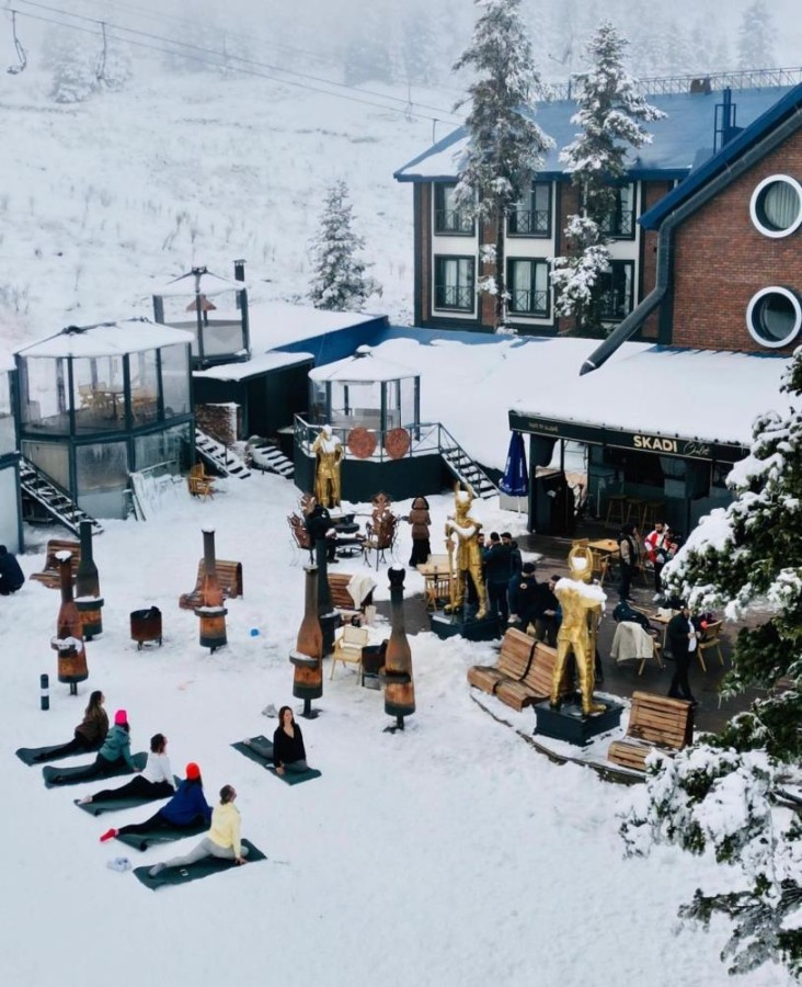 Uzman bir eğitmen tarafından işletmenin müşterilerine ve isteyen herkesin katılımına açık olan etkinlik soğuk havaya rağmen dikkat çekiyor. Karların üzerindeki yoga derslerine soğuk havaya rağmen tişörtlerle katılan turistler bu şekilde soğuğa karşı adaptasyon sağlıyor. Karların üzerinde yoga eğitimlerine ilgi her geçen gün daha da artıyor.