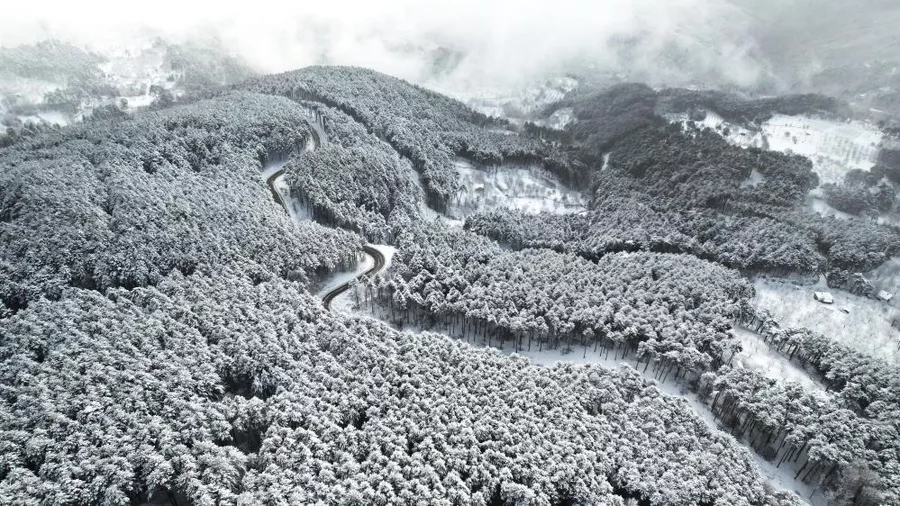 Kış mevsiminin etkisiyle beyaza bürünen ormanlık alanlar arasında ilerleyen yollar, havadan çekilen görüntülerde kartpostallık kareler oluşturdu.