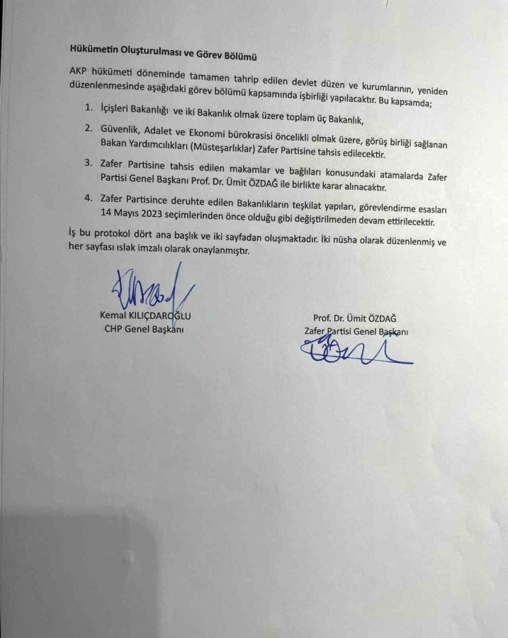 Zafer Partisi Genel Başkanı Ümit Özdağ, eski CHP Genel Başkanı Kemal Kılıçdaroğlu ile cumhurbaşkanlığı ikinci tur seçimleri öncesi yaptıkları protokolü yayımladı. Protokolde, aralarında İçişleri Bakanlığı'nın da olduğu toplam üç bakanlığın Zafer Partisi'ne verilmesi konusunda anlaşıldığı görüldü.