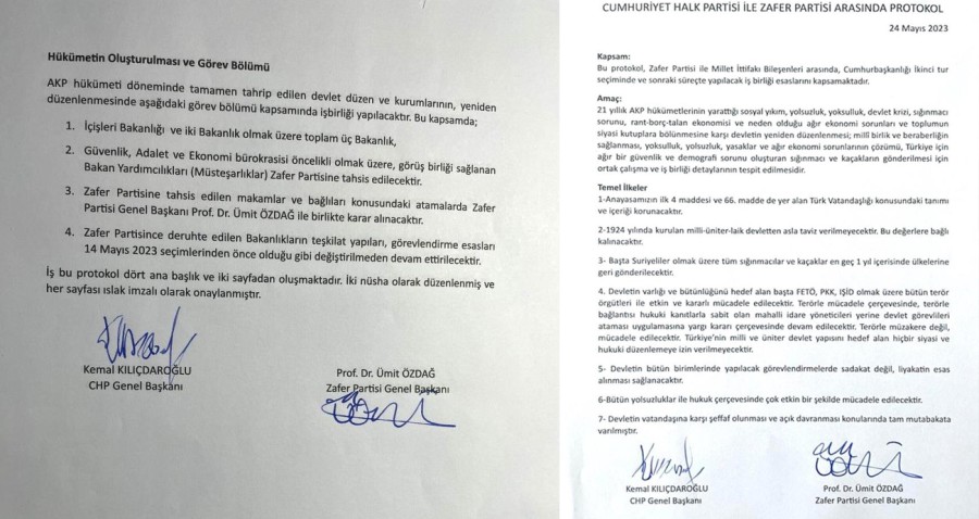 Zafer Partisi Genel Başkanı Ümit Özdağ, CHP Genel Başkanı Kemal Kılıçdaroğlu ile 28 Mayıs'taki cumhurbaşkanlığı seçimleri öncesinde imzaladığı protokolü kamuoyuyla paylaştı. Özdağ, sosyal medya hesabından yaptığı paylaşımda, "Aşağıda üzerinde çok konuşulan ancak ilk kez yayınlanan Zafer Partisi-CHP Protokolünün tamamının fotoğrafını göreceksiniz. Bu protokolü eleştiren 6'lı masa birleşenlerine ve CHP içinden protokole karşı çıkanlara cevap veriyorum. 14 Mayıs'ta yapılan seçimlerin 1. turunu hem parlamento hem cumhurbaşkanlığı seçiminde kaybettiniz. 14 Mayıs seçimleri öncesinde Zafer Partisi ile her türlü görüşmeyi reddetmiştiniz" dedi.