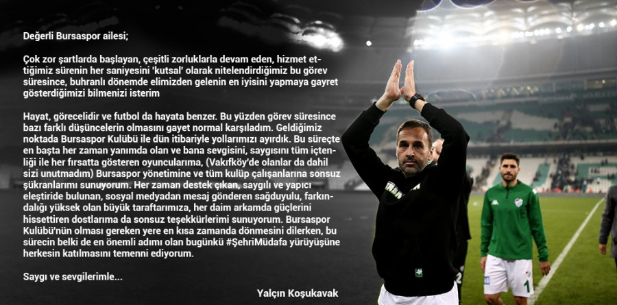 Bursaspor'un eski teknik direktörü Yalçın Koşukavak, sosyal medya hesabı Twitter'dan bir veda mesajı yayınladı.