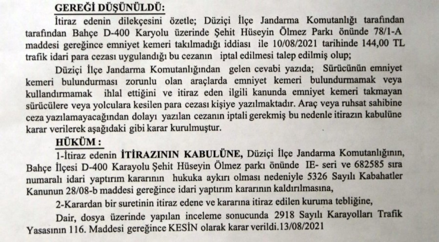 İtiraz dilekçesini dikkate alan Bahçe Sulh Ceza Hakimliği ise emsal bir kararla cezanın plaka ya da araç sahibine değil, kişiye kesilebileceğine karar verdi. Kararda ayrıca idari yaptırım kararının, hukuka aykırı olduğuna dikkat çekilerek, verilen cezanın iptal edilmesine hükmetti.