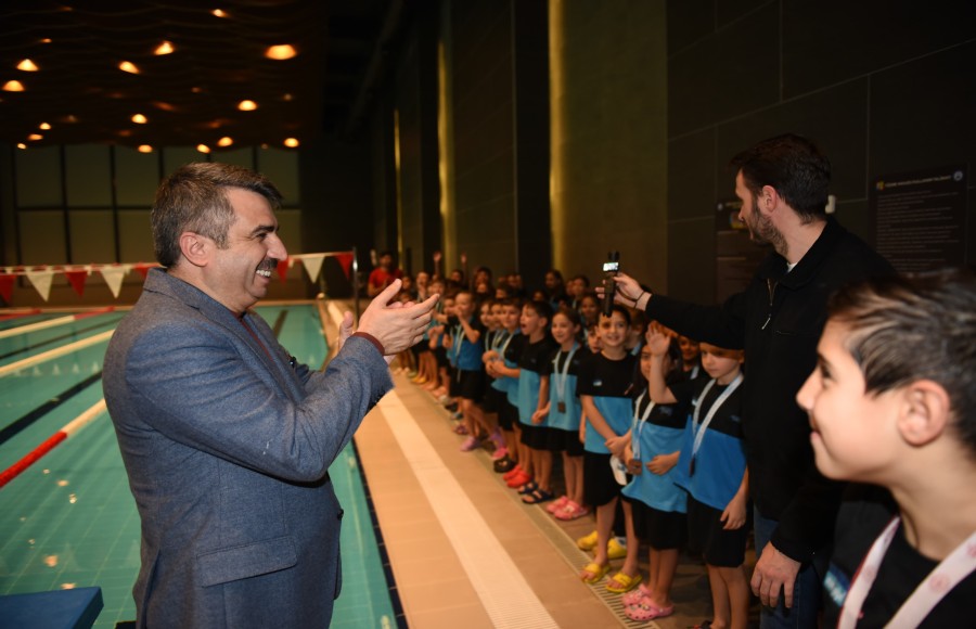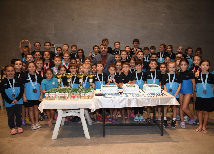 Yıldırım Belediye Başkanı Oktay Yılmaz, 29 Ekim Cumhuriyet Kupası ve 10 Kasım Atatürk'ü Anma Yüzme Yarışlarında takım olarak tüm kategorilerde şampiyon olan Yıldırım'ın altın kulaçlarıyla buluştu.