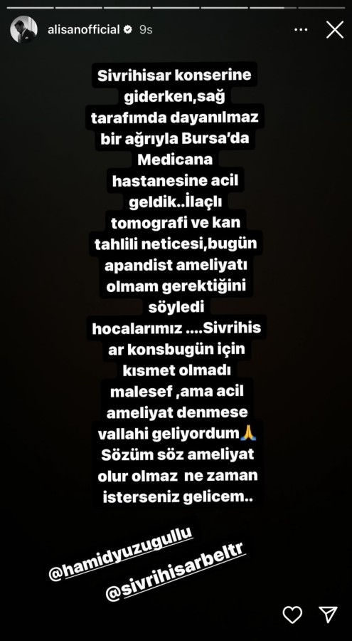 Alişan, sosyal medya hesabından yaptığı açıklamada, "Sivrihisar konserine giderken sağ tarafımda dayanılmaz bir ağrıyla Bursa'da acile geldik. İlaçlı tomografi ve kan tahlili neticesi bugün apandisit ameliyatı olmam gerektiğini söyledi hocalarımız. Sivrihisar konseri bugün için kısmet olmadı maalesef. Acil ameliyat denmese vallahi geliyordum. Sözüm söz, ameliyat olur olmaz ne zaman isterseniz geleceğim" dedi.
