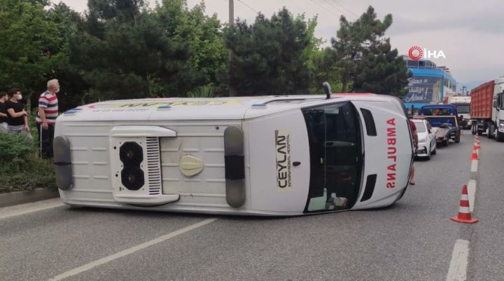 Bursa'nın Orhangazi ilçesinde Göl Yolu kavşağında meydana gelen trafik kazasında Bursa'dan Yalova'ya bir hasta götürdükten sonra dönüş yoluna geçen özel firmaya ait bir ambulans kavşakta otomobille çarpıştı. Savrulan ambulans devrilirken, ambulansta bulunan şoför ve iki sağlık görevlisi ile birlikte otomobil sürücüsü hafif yaralandı.