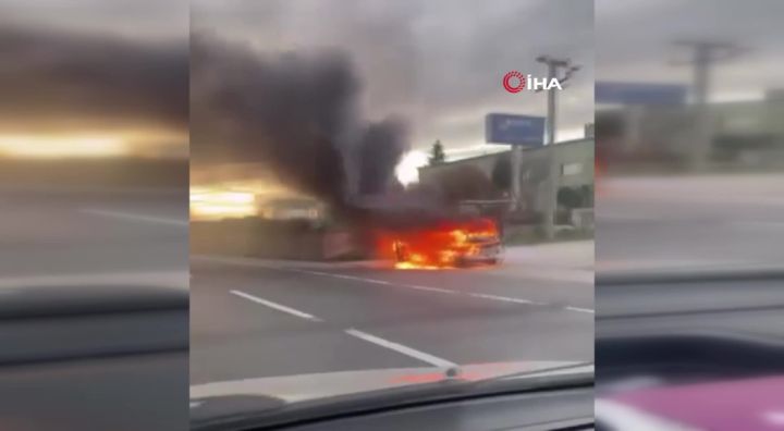 Bursa'nın İnegöl ilçesinde seyir halindeki otomobil, alev topuna döndü. Patlamanın da yaşandığı yangın, bir başka vatandaş tarafından böyle kayda alındı.