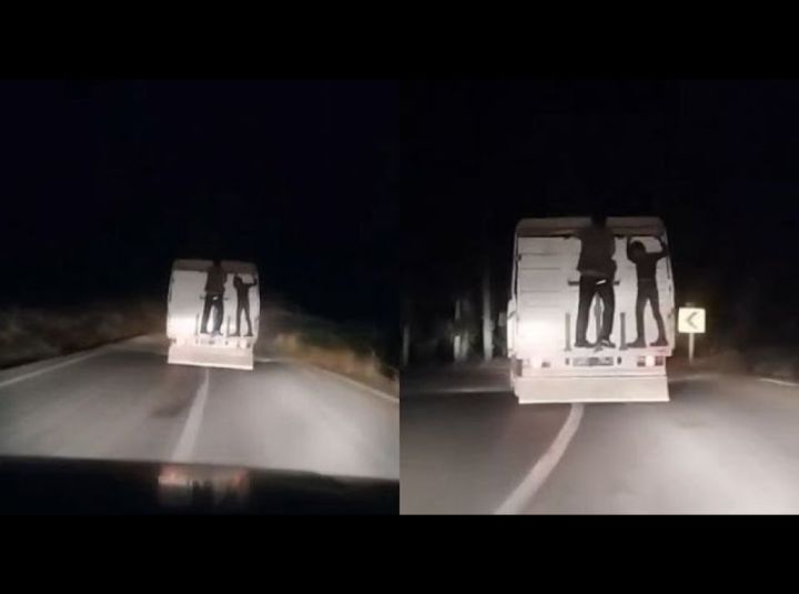 Bursa'da kamyonetin arkasında asılı giden baba ve oğlu, canlarını hiçe saydı. Arkadan gelen otomobil için de tehlike saçan 2 kişi, inişli çıkışlı virajlı yolda asılı bir şekilde ilerlemeye devam etti.