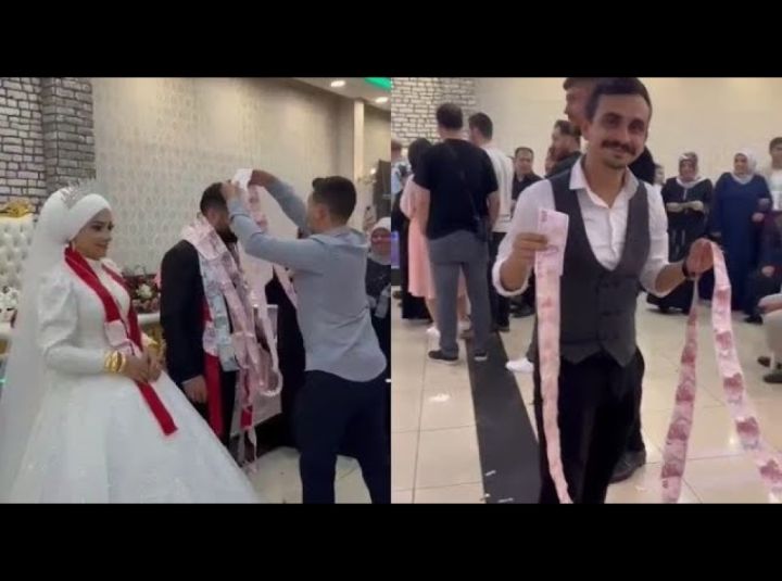 Bursa'da gerçekleşen bir düğünde gelin ve damada arkadaşları tarafından 45 metre para takıldı.