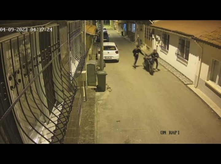 Bursa'nın Osmangazi ilçesinde 2 hırsız önce keşif yaptılar sonrasında motoru çalıp kayıplara karıştılar. Olay güvenlik kamerasına yansıdı.