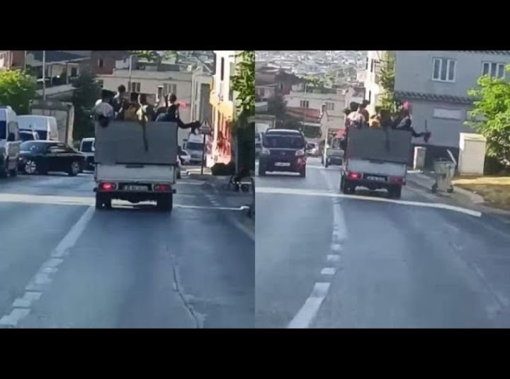 Bursa'da düğünleri olduğu için açık kasa kamyonetin kasasına binip kilometrelere yol giden 8 kişinin tehlikeli yolcuğu amatör kameraya saniye saniye yansıdı.
