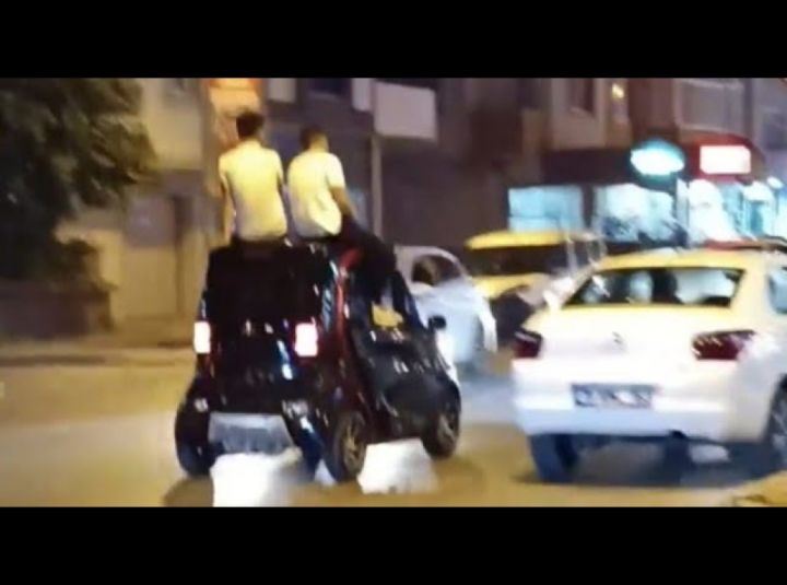Bursa'nın İnegöl ilçesinde gençlerin elektrikli araç üzerinde seyretmeleri amatör kameraya yansıdı.