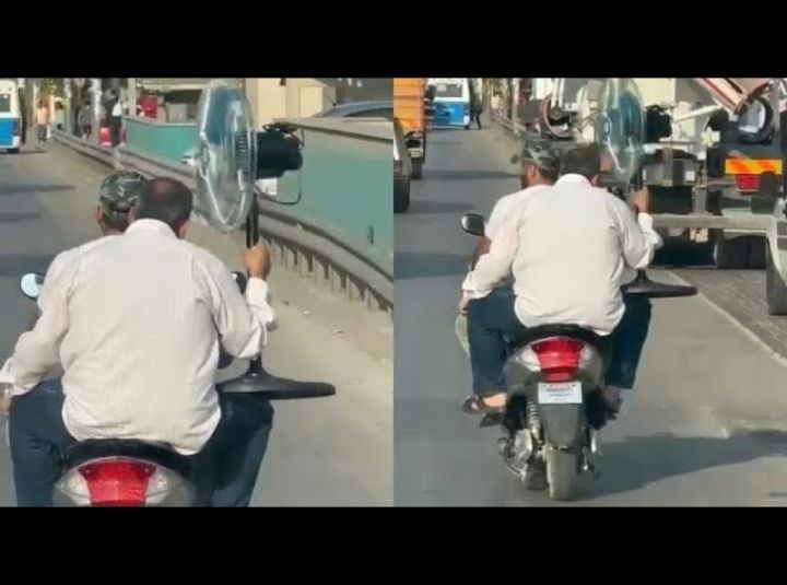 Bursa'da artan hava sıcaklığı nedeniyle elektrikli bisiklet ile giden bir vatandaş, serinlemek için çareyi vantilatörde buldu. Sürücünün arkasında bir eliyle vantilatörü, diğer eliyle iki tekerlekli araca tutunan adam doğal klimasıyla trafikteki diğer sürücülerin kamerasına yansıdı.