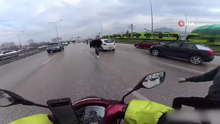 Bursa-İzmir yolu üzerinde iki sürücü arasında "yol verme" meselesi nedeniyle tartışma çıktı. Tartışmanın kısa sürede büyümesiyle sürücüler araçlarından inerek kavga etmeye başladı. Tarafların birbirine uçan tekmeyle saldırdığı anlar çevredeki vatandaşlar tarafından cep telefonu kamerasıyla kaydedildi.Korku dolu anların yaşandığı kavgaya, yoldan geçen bir kurye ile çevredeki sürücüler müdahale ederek tarafları ayırdı. Olayın ardından görüntüler üzerine harekete geçen Bursa İl Emniyet Müdürlüğü ekipleri, kavgaya karışan sürücülerin kimliklerini tespit etmek için çalışma başlattı.