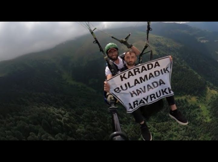 Yamaç paraşütü ile atlayan 34 yaşındaki Trabzonlu Muhittin Akbaş, evlenmek için görüştüğü kızların kendisinden ekonomik olarak çok zorladığını ve ev-araba gibi taleplerde bulunduğunu belirterek bu durumu bin 500 metre yükseklikte gökyüzünde açtığı "Karada bulamadık, havada arayruk" pankartı ile protesto etti.