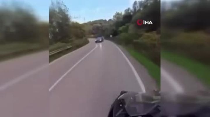 Bursa Gemlik yolu üzerinde seyir halinde olan bir motosikletli, kontrolden çıkarak karşı şeride geçen otomobile çarpmaktan son anda kurtuldu. O anlar motosikletlinin kask kamerasına saniye saniye yansıdı.