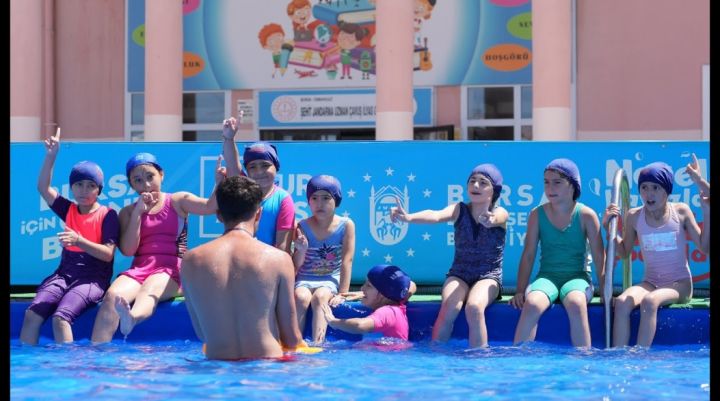 Bursa Büyükşehir Belediyesi, 'Neşeli Havuzlar Mutlu Çocuklar' projesi kapsamında kurduğu portatif yüzme havuzları ile okul bahçelerini adeta tatil köyüne dönüştürdü. 3 ilçedeki 4 okul bahçesine kurulan portatif havuzlarda çocuklara ücretsiz yüzme eğitimi verilirken, isteyen çocuklar ise aquaparkta eğlencenin tadını çıkarıyor.