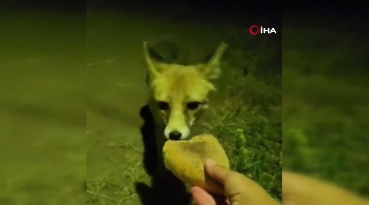 Bursa'da bir vatandaş, yanına gelen tilkiyi elleriyle besledi.
