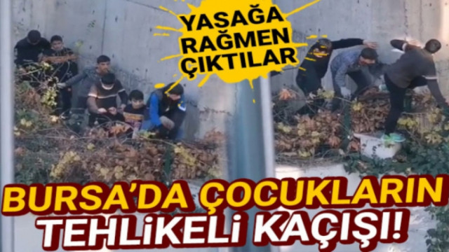 Bursa'da sokağa çıkma kısıtlamasına rağmen okul bahçesinde top oynayan 6 çocuk, polisin siren sesini duyunca kaçtı. Polis sokaktan gidene kadar yüksek bir duvarın üzerinde bekleyen maskesiz çocuklar, tehlikeye aldırış etmedi. O anlar ise cep telefonunun kamerasına yansıdı.
